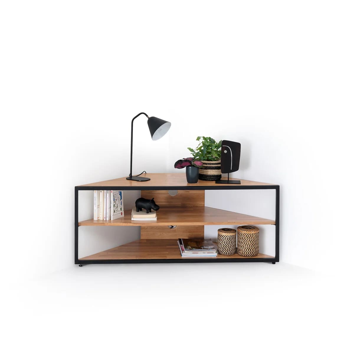 Преимущества угловой тумбочки для ТВ из массива дуба и стали